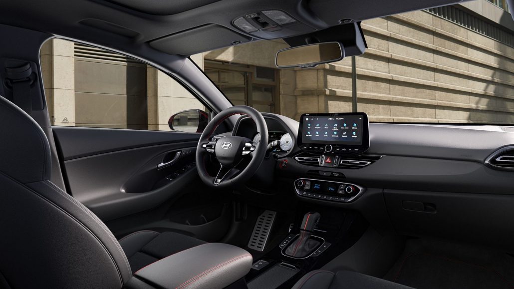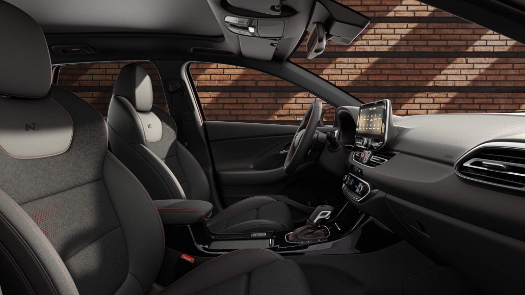 In comparatie cu varianta standard, versiunea i30 N Line beneficiaza de elemente estetice mai sportive, evidentiate la nivelul grilei. Totodata, tapiteria din piele & piele intoarsa se remarca prin cele trei linii orizontale rosii. In partea laterala, modelul prezinta insertii metalice de culoare inchisa. Clientii pot opta pentru jantele actualizate de 17 si 18 inchi.