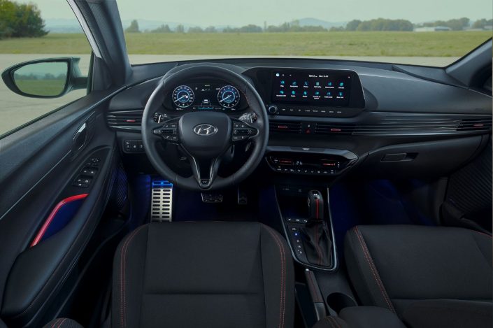La interior, scaunele si volanul sport, pedalele cu insertii metalice si schimbatorul de viteze din piele – personalizate cu accente rosii si logo-ul „N” – contribuie la o experienta placuta pentru conducatorul auto.